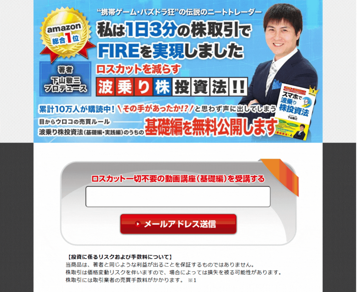 そんな、ロスカットをしない、チャートも見ない株式投資法、「波乗り株投資法」を開発した人である下山氏。 下山氏は働きたくないから株を始めたとんでもないずぼらな人です。 働きたくない一心でこの手法を極め、たった5分で株式投資で荒稼ぎし、毎日23時間55分を自由に過ごせる生活を手にしました。